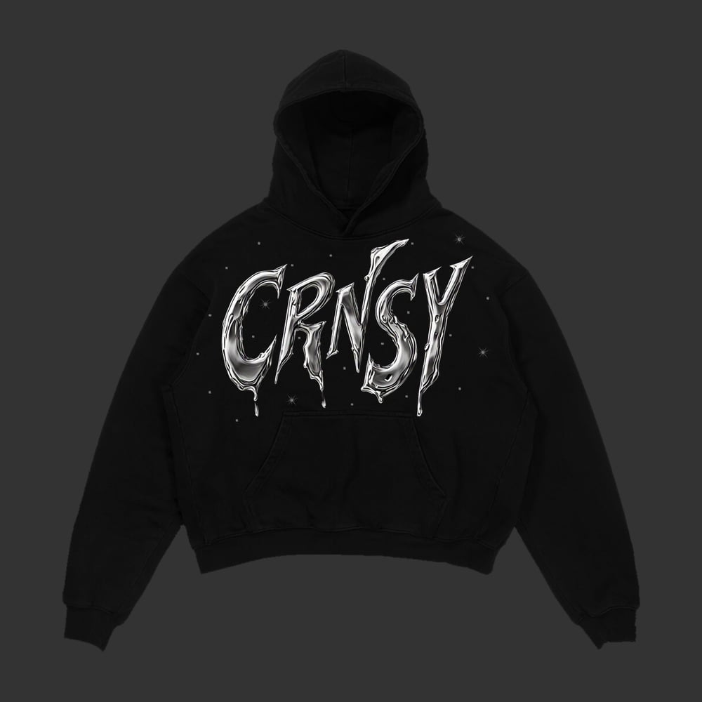 The centerpiece is the bold chrome-inspired CRNSY graphic, giving off a liquid metal effect that catches light and adds depth to the design. Subtle detailing around the print enhances the overall aesthetic without overpowering it.